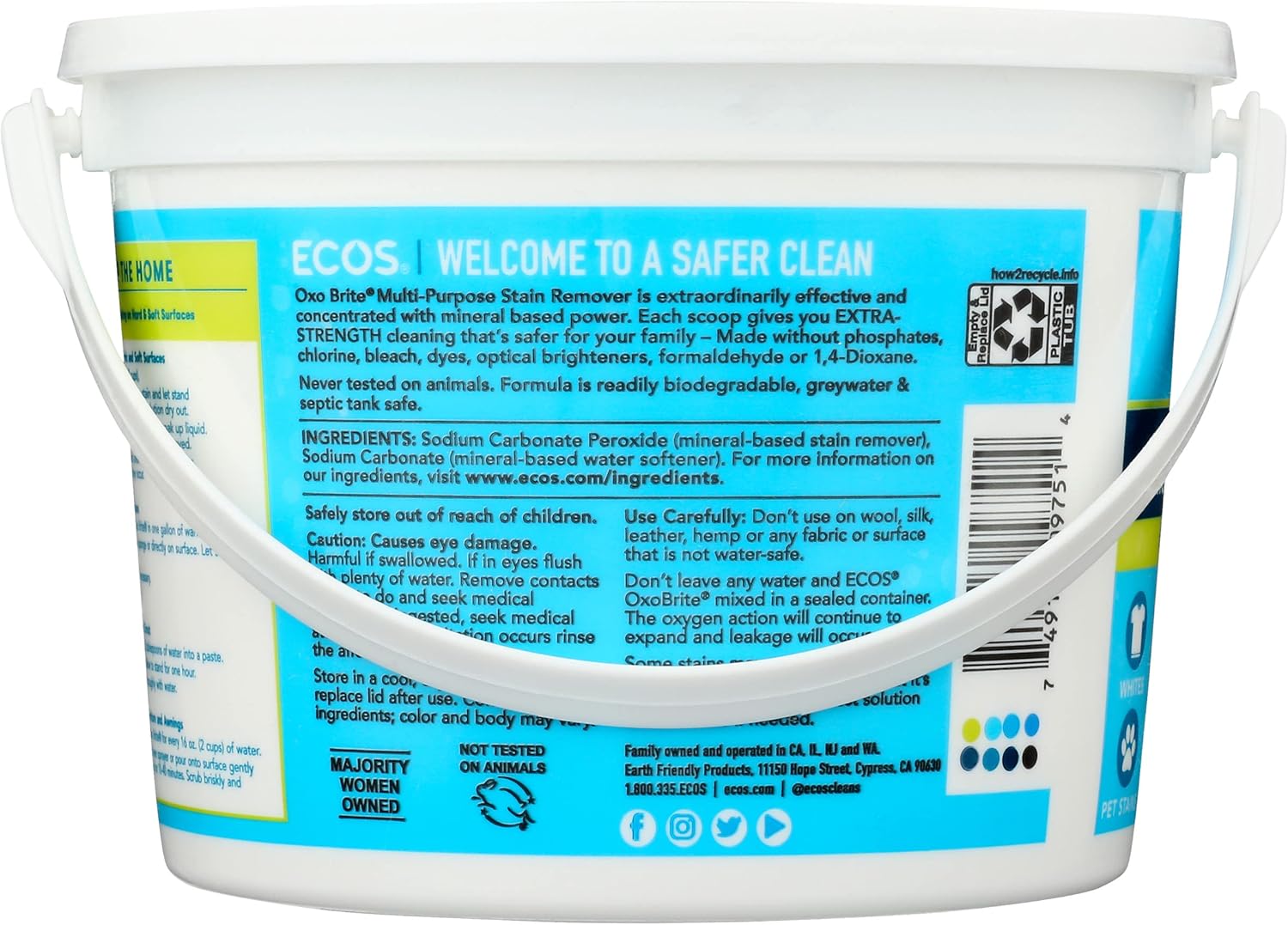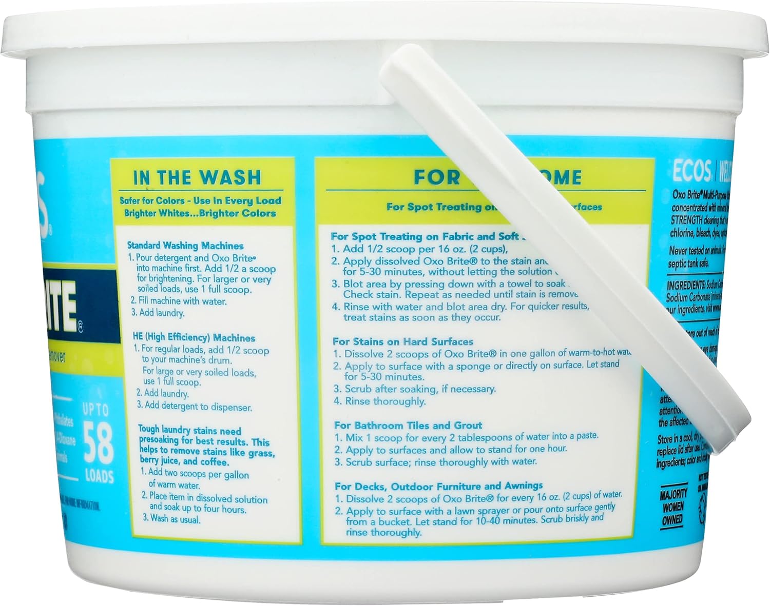ECOS Oxo Brite Multi-Purpose Stain Remover is a powerful, mineral-based cleaner designed to lift stains, brighten colors, and whiten whites. Made with sodium carbonate peroxide and sodium carbonate, it offers a safer alternative to traditional bleach. This fragrance-free formula is ideal for those sensitive to scents and is effective in both warm and cold water washes. Whether used as a laundry booster or for spot treatment, Oxo Brite delivers exceptional cleaning performance without harsh chemicals. Plus, it's made in the USA using 100% renewable energy, ensuring a product that's both effective and environmentally friendly.